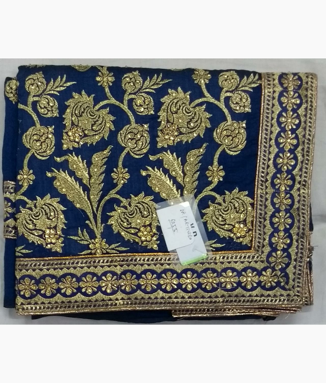 All over golden colour zari leaf flower design on saree. Sequence work outline all over saree. Heavy panel is of leaf and flower design with zari and sequence work.