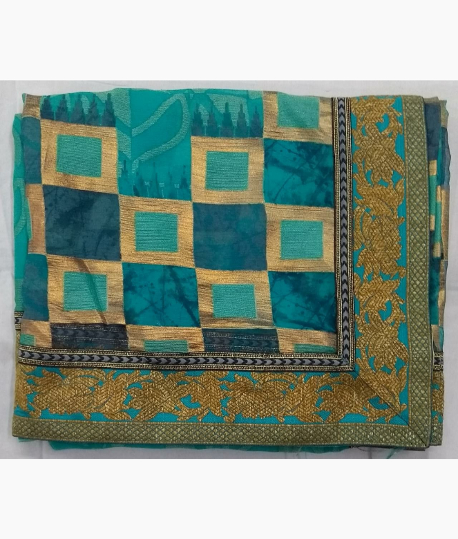 All over check two shades weaving boota design on saree. Golden colour zari check design on panel all over saree with black piping on all over saree.