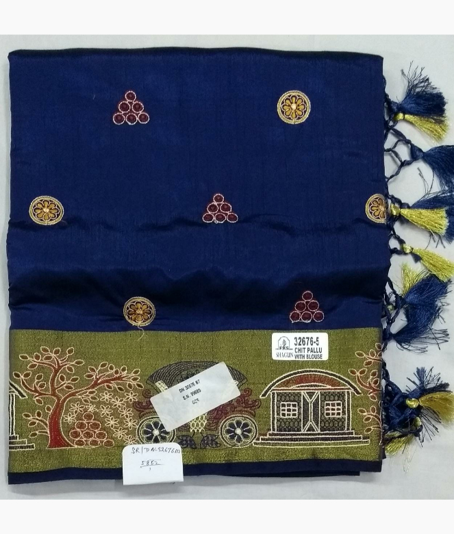 One side border design with multi colour thread work of tree and hut design with bull cart embedded in golden colour of zari looks beautiful. Blouse is plain in fabric with golden colour broad patta for back and sleeves.