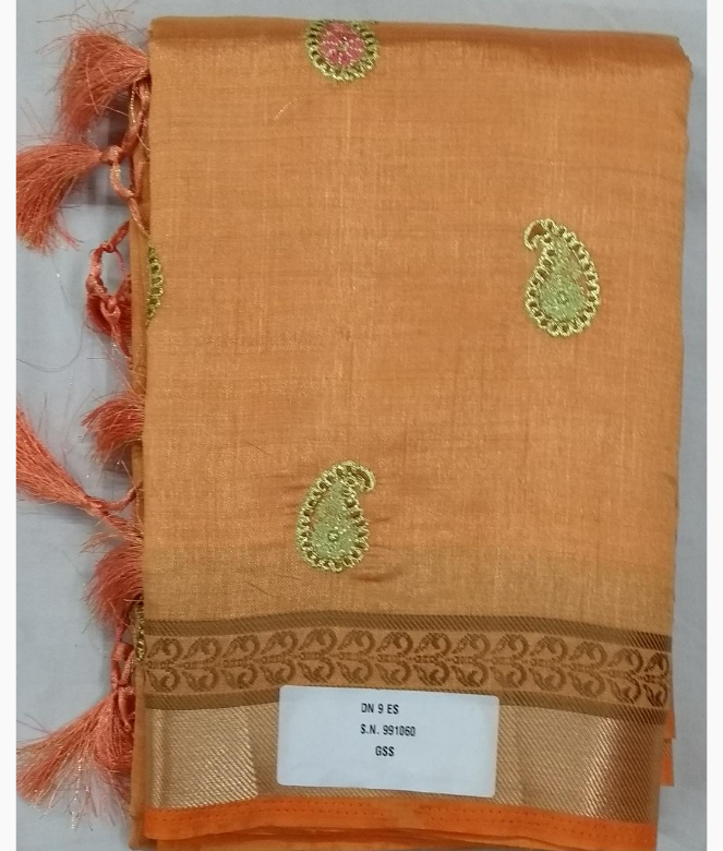 All over Multi colour thread booty with outline golden colour zari work on saree. Heavy pallu of strip design with latkan.