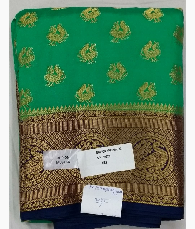 All over small peacock design golden colour zari booty jaal on saree. Big ambi design in zari work on pallu in blue contrast colour.