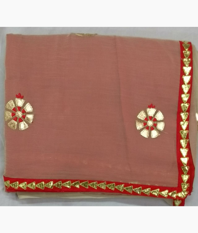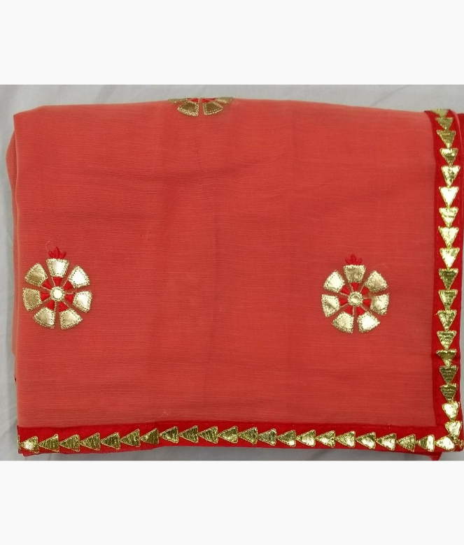 All over goota round flower design on saree with fine quality of go0ta and red colour thread inside the flower boota on saree.