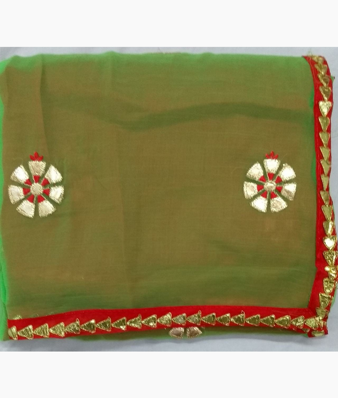 Border is of red contrast colour piping with arrow design go0ta work. Blouse is of row silk fabric with matching same border of saree in contrast colour.