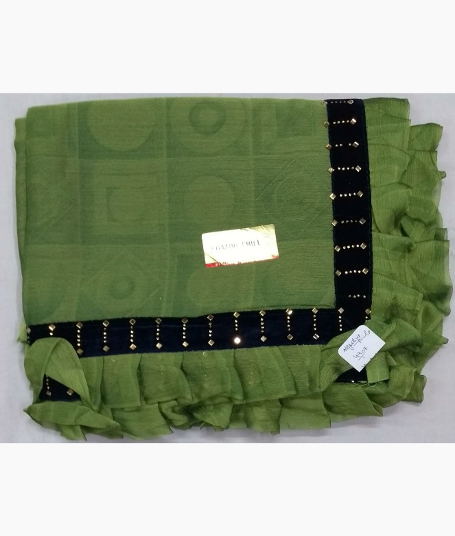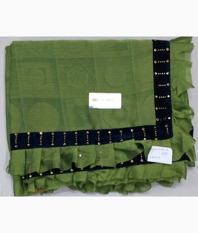 Contrast colour black velvet patti on border with mirror work and sequence work on border patti with frill surrounding all over on saree. Blouse is of dupion silk fabric with matching same border of saree along contrast colour on blouse.