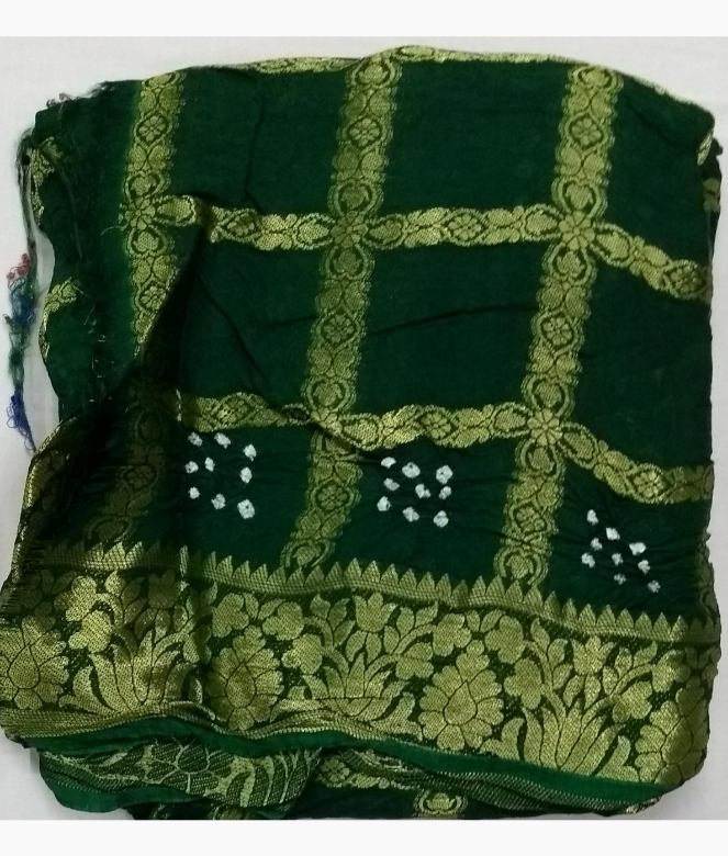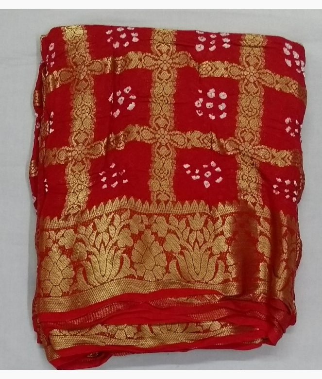 All over ghatchola design on saree with golden colour zari. Fine quality zari and bhandhej work style on saree.