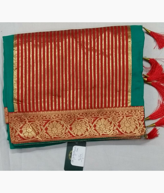 Border is of Banarasi flower zari design in contrast colour on saree. Contrast colour with Banarasi weaving. Blouse is of dot design with contrast colour and border patti for neck and sleeves.