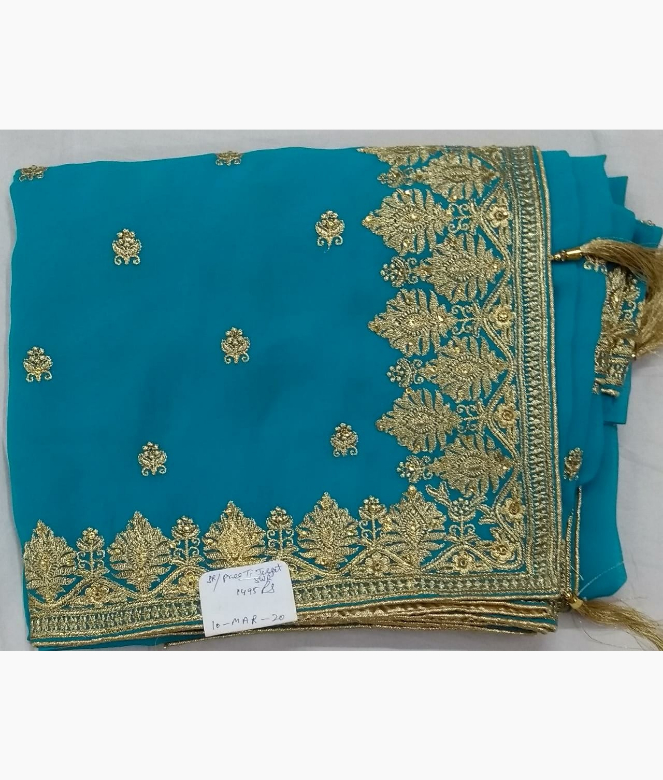 Border is of golden colour zari big flower design with sequence work surrounding piping on all over saree in golden colour. Matching work of saree border is on blouse for neck and sleeves.