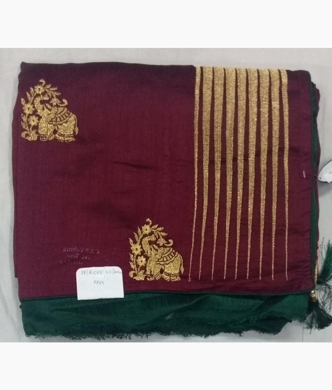 All over golden colour tree with elephant design booty on saree. zari work on tree with elephant booty.