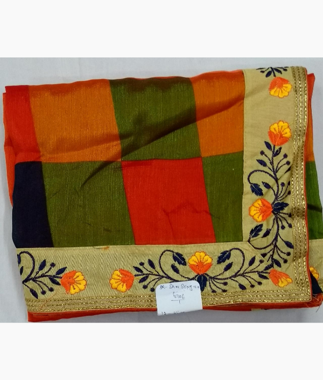 Border is of contrast colour Patti with multi colour flower and leaf ambi on Patti with golden colour zari strips on saree. Matching same border of saree is on blouse Patti for neck and sleeves.