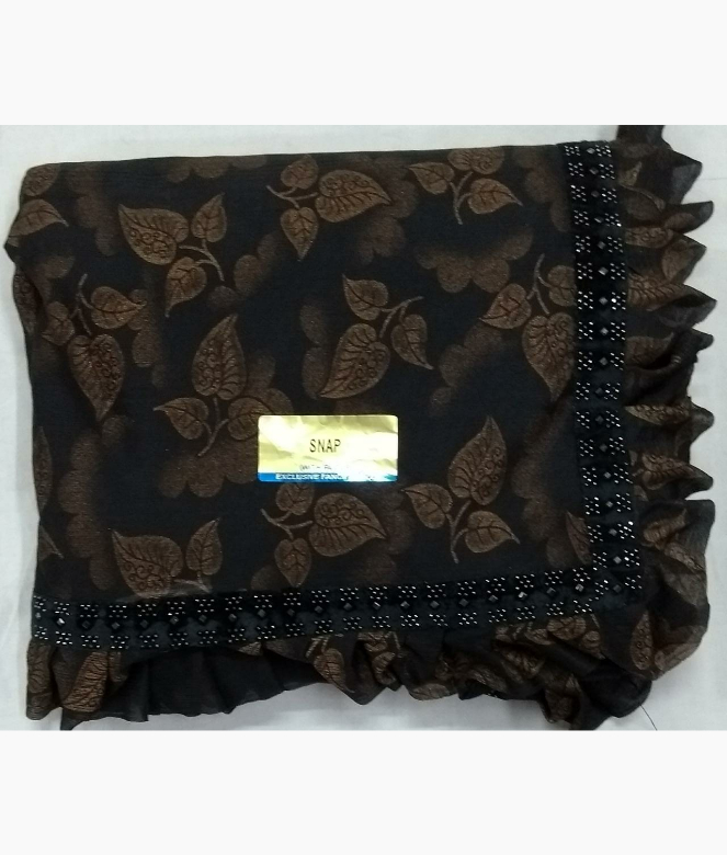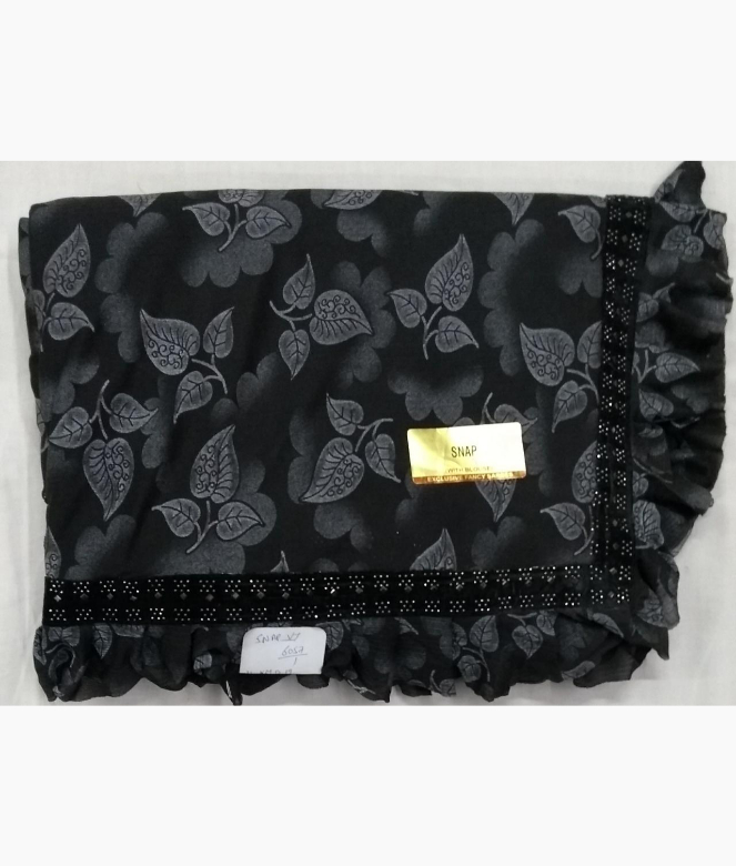 All over leaf design photogenic printing jaal on saree. Border is of velvet black colour patti with mirror work and sequence work on saree with frill design on all over saree.